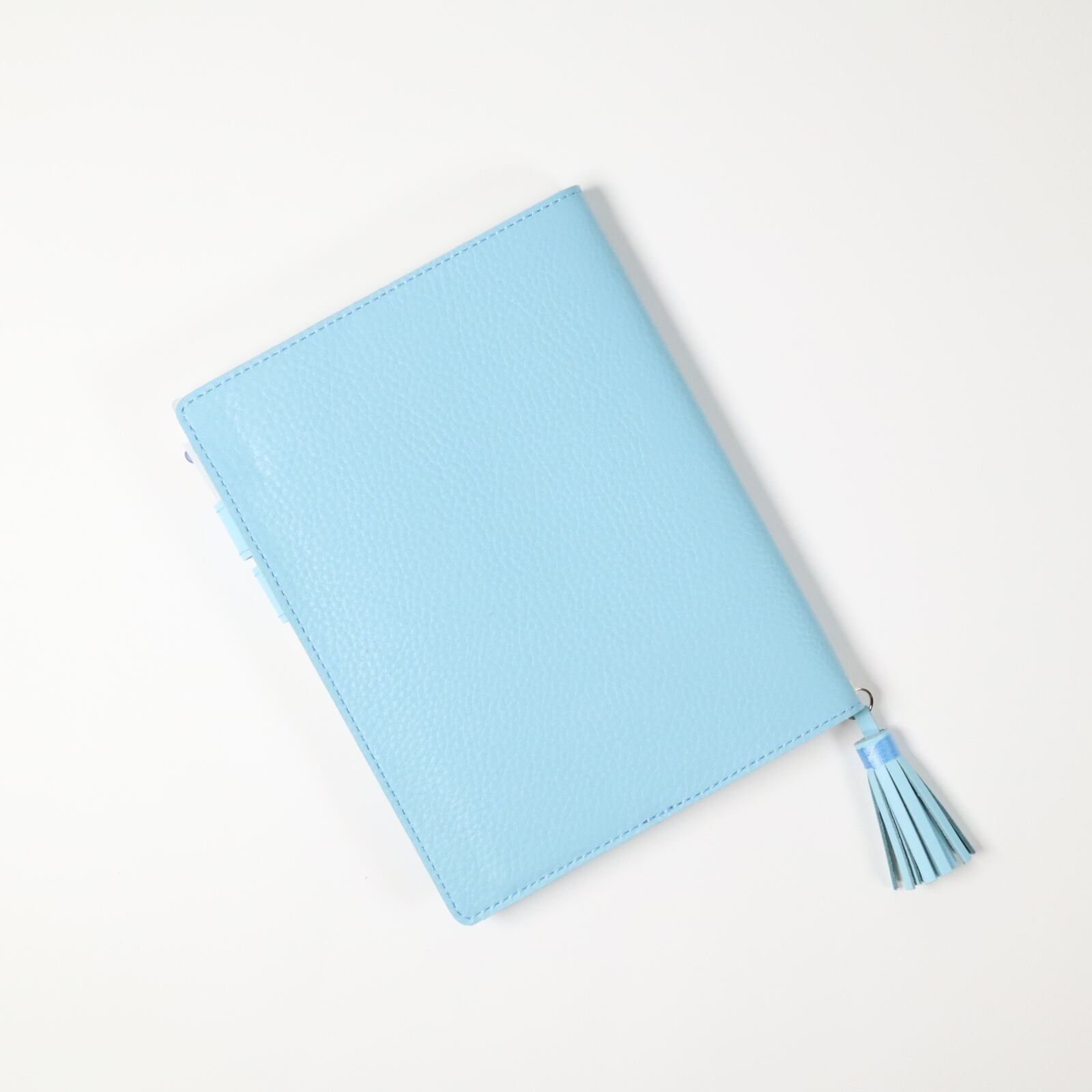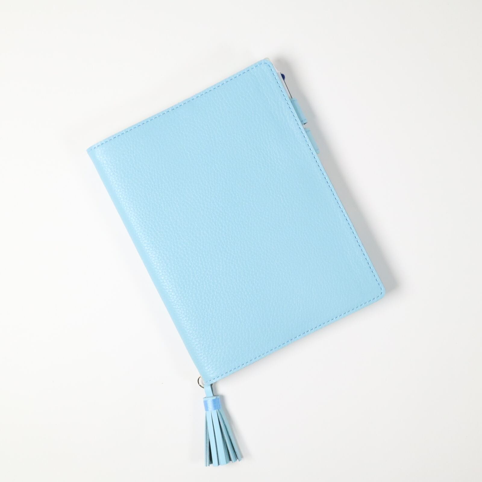 水色の牛革で制作したA6サイズの手帳用カバーです。